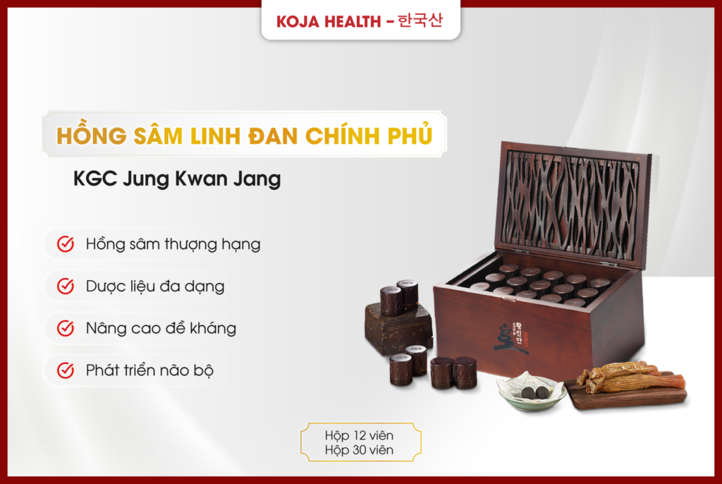 Hồng sâm linh đan KGC Jung Kwan Jang là món quà sang trọng được bào chế một cách tỉ mỉ và nghiêm túc bởi các bậc thầy hồng sâm. Sản xuất từ những củ hồng sâm cao cấp đã qua tuyển chọn chất lượng nghiêm ngặt, chỉ nằm trong 2% loại hảo hạng, sản phẩm phù hợp với người cần bồi bổ thể lực nhanh, người ưa thích nguyên liệu từ hồng sâm cao cấp, người hay mệt mỏi, thể chất yếu, người muốn giảm căng thẳng.
