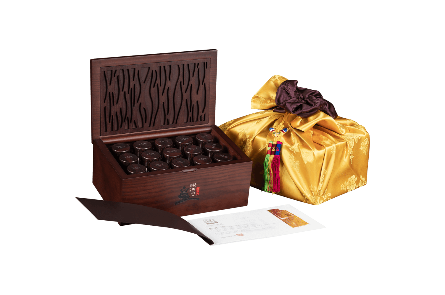 Bột hồng sâm 6 năm tuổi 34% (Ginsenoside Rg1+Rb1+Rg3 5mg/g), bột nấm thượng hoàng, bột nhung hươu, chiết xuất chi đương quy, bột sơn thù du, chiết xuất nấm kim châm, bột cây địa hoàng, bột đậu nành, mật ong, hương liệu thiên nhiên (hương thảo mộc).